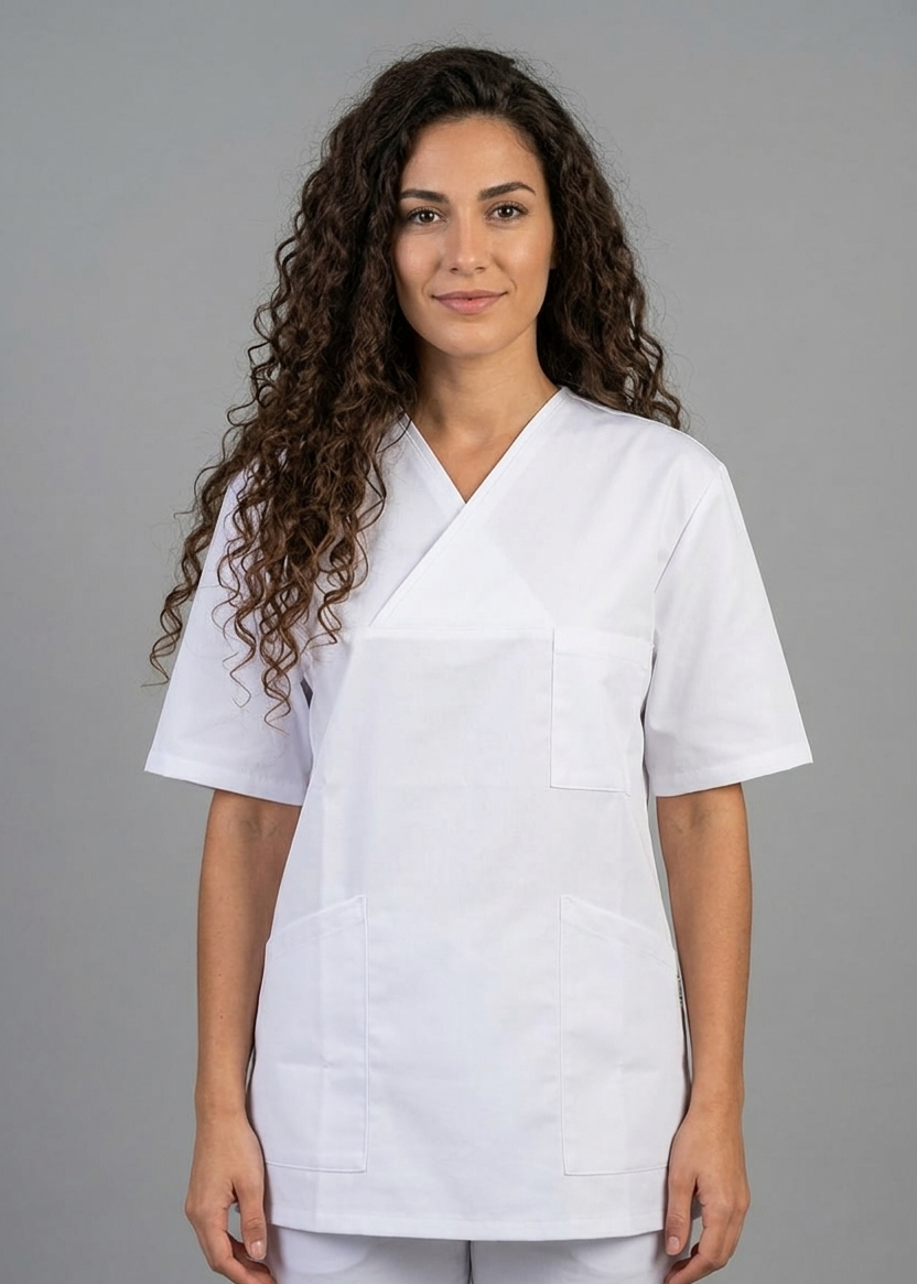 Kurzarm, überlappender V-Ausschnitt, gerade geschnitten, 1 Brusttasche, 2 Seitentaschen, Seitenschlitze (da Unisex, fällt der Kasack eher groß aus!)