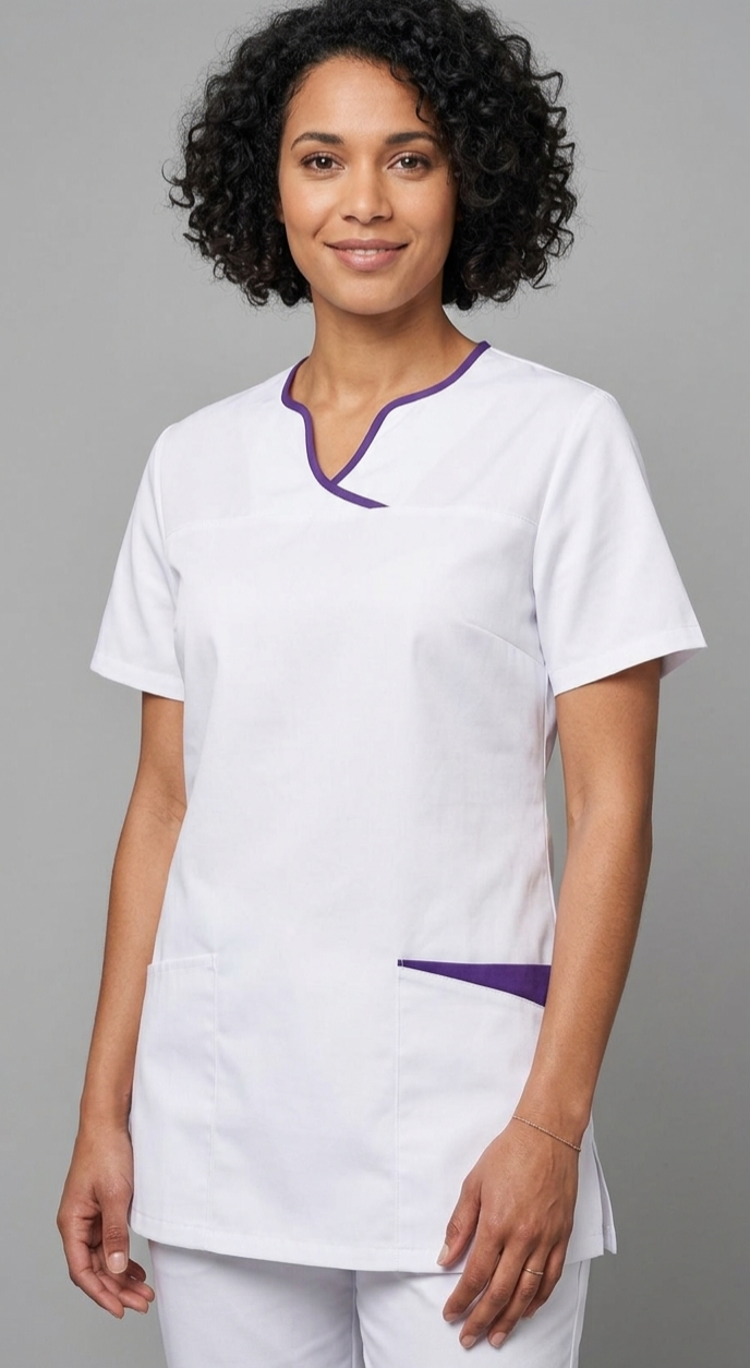 Kasack, Damenkasack, BERBEL, weiss mit lila Einsätzen